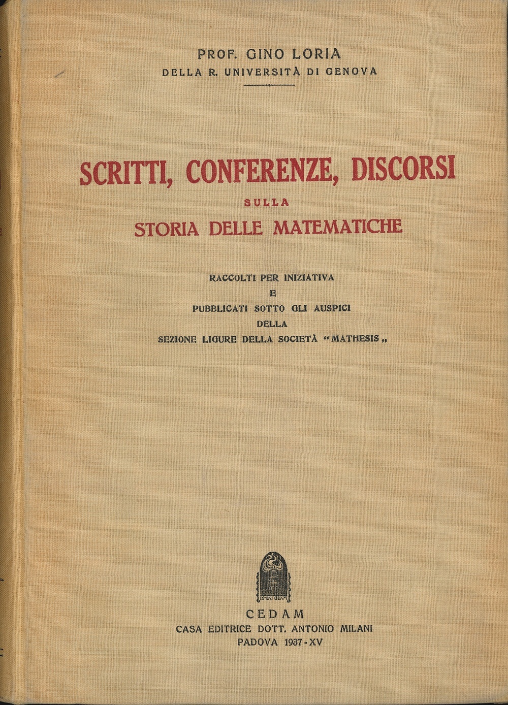 Alcuni degli estratti esposti sono stati raccolti in: "Gino Loria, Scritti, conferenze, discorsi sulla storia delle matematiche. Raccolti per iniziativa e pubblicati sotto gli auspici della sezione Ligure della società "Mathesis", Padova, Cedam 1937, pubblicazione offerta all'Autore dalla Società Mathesis, di cui era Presidente della sezione Ligure, in occasione del suo collocamento a riposo per raggiunti limiti di età nel 1935. Il libro è disponibile in biblioteca.