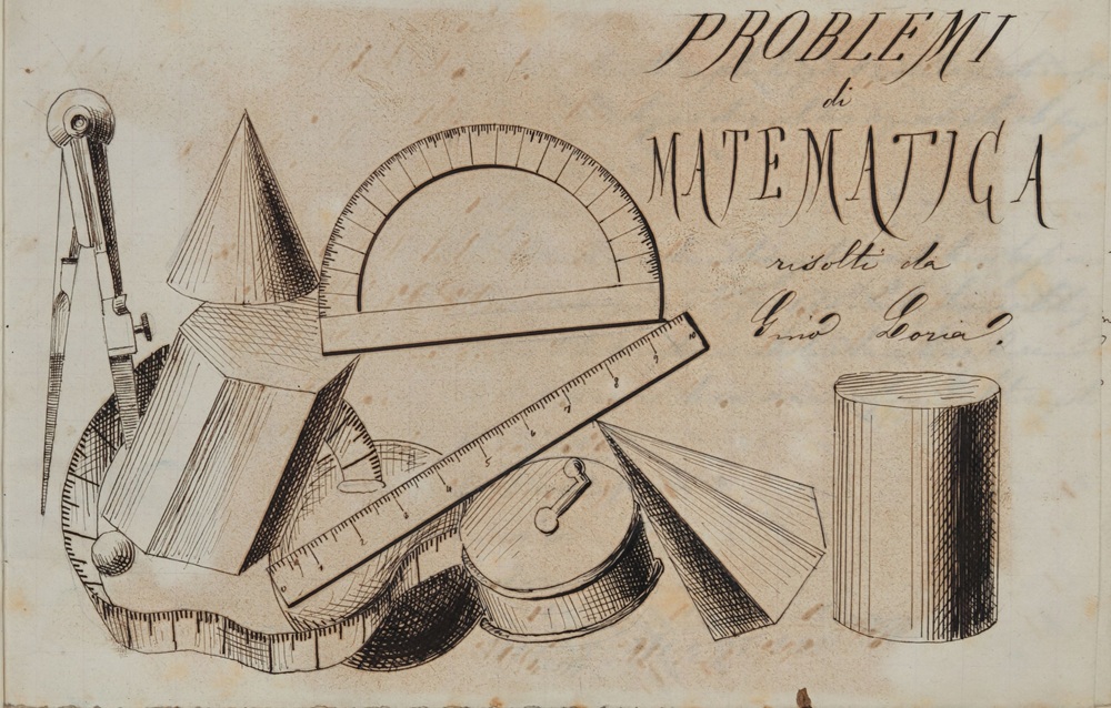 Il quaderno 5 "Problemi di matematica risolti da Gino Loria" presenta una legatura più strutturata e un motivo grafico a firma Loria nel frontespizio. Abbiamo scelto tale immagine come "logo" del progetto espositivo.